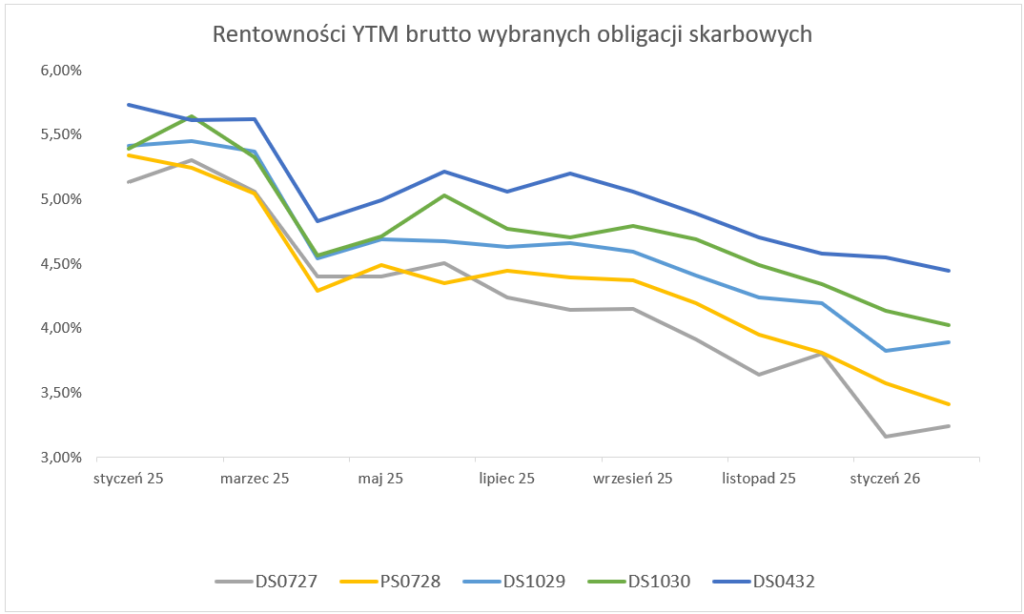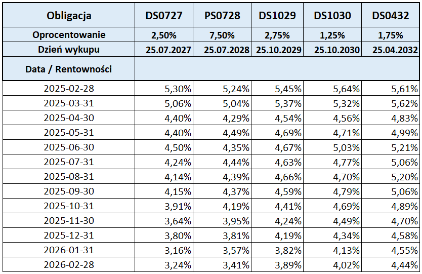 Poniższy wykres prezentuje zmiany rentowności od stycznia 2025 r. do lutego 2026, z podziałem na serie obligacji. W ostatnich kilku miesiącach odnotowujemy raczej niższe wartości rentowności. W ciągu ostatnich kilku miesięcy wartości nie przekroczyły 5% i mają tendencję raczej spadkową.