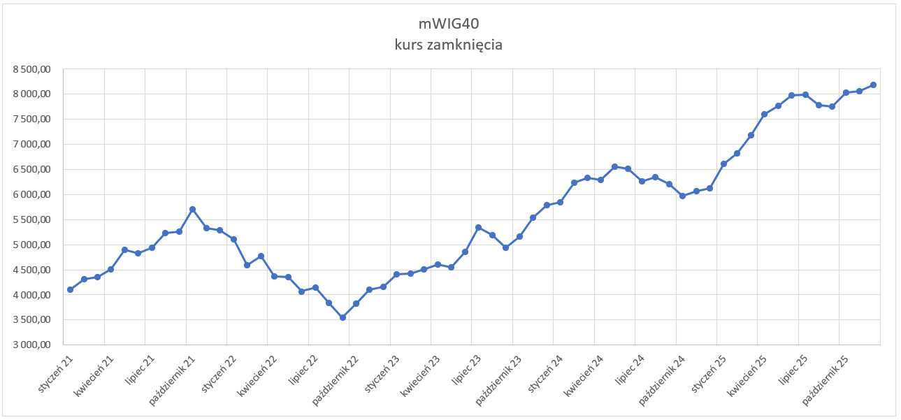 W grudniu indeks mWIG40 również zanotował historyczny wzrost. Jego wartość wzrosła z 8 065,83 pkt (30.11.2025) do 8 182,06 pkt (31.12.2025), co przekłada się na miesięczny wzrost o 1,4%. Roczny przyrost z kolei wynosi aż 33,6%. Szczegóły zebrano w poniższej tabeli.