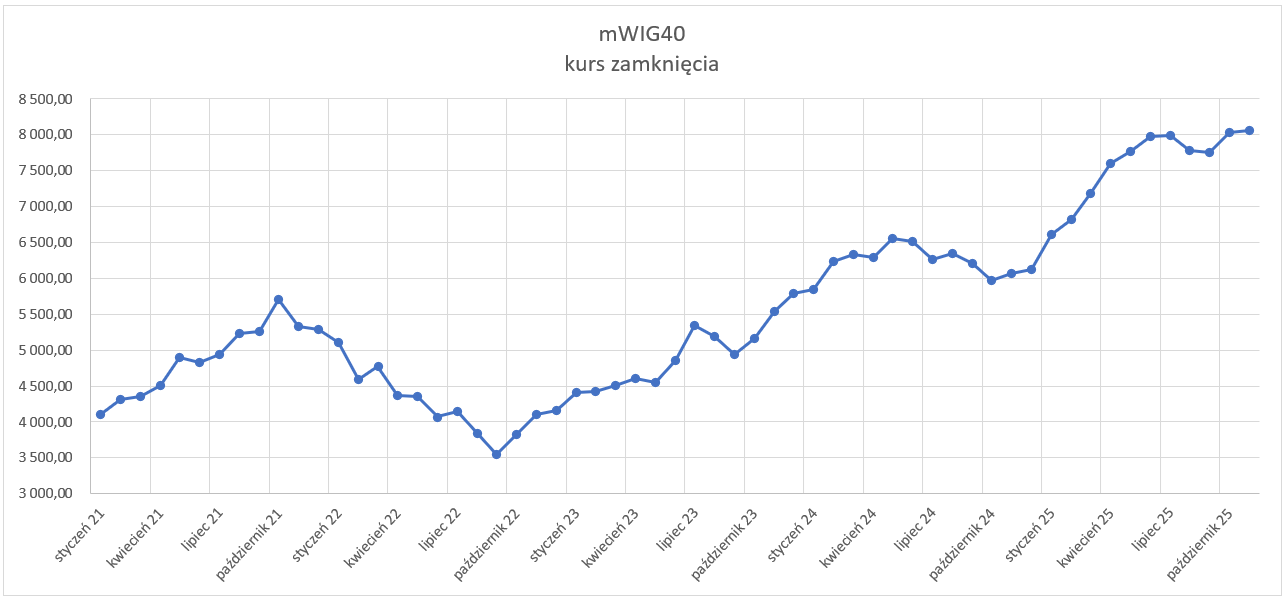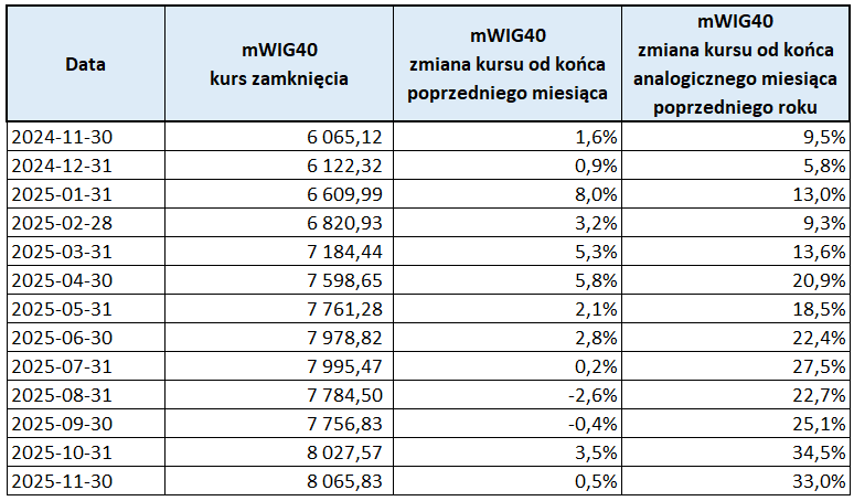 W listopadzie indeks mWIG40 również zanotował historyczny wzrost. Jego wartość wzrosła z 8 027,57 pkt (31.10.2025) do 8 065,83 pkt (30.11.2025), co przekłada się na miesięczny wzrost o 0,5%. Roczny przyrost z kolei wynosi aż 33%.