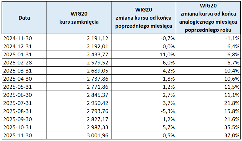 Na koniec listopada 2025 indeks WIG20 osiągnął poziom 3 001,96 pkt, co oznacza wzrost w stosunku do poprzedniego miesiąca. Wartość ta jest największą w analizowanym przez nas okresie ostatnich 12 miesięcy. Dynamika roczna, liczona od listopada 2024, wynosi aż 37%.