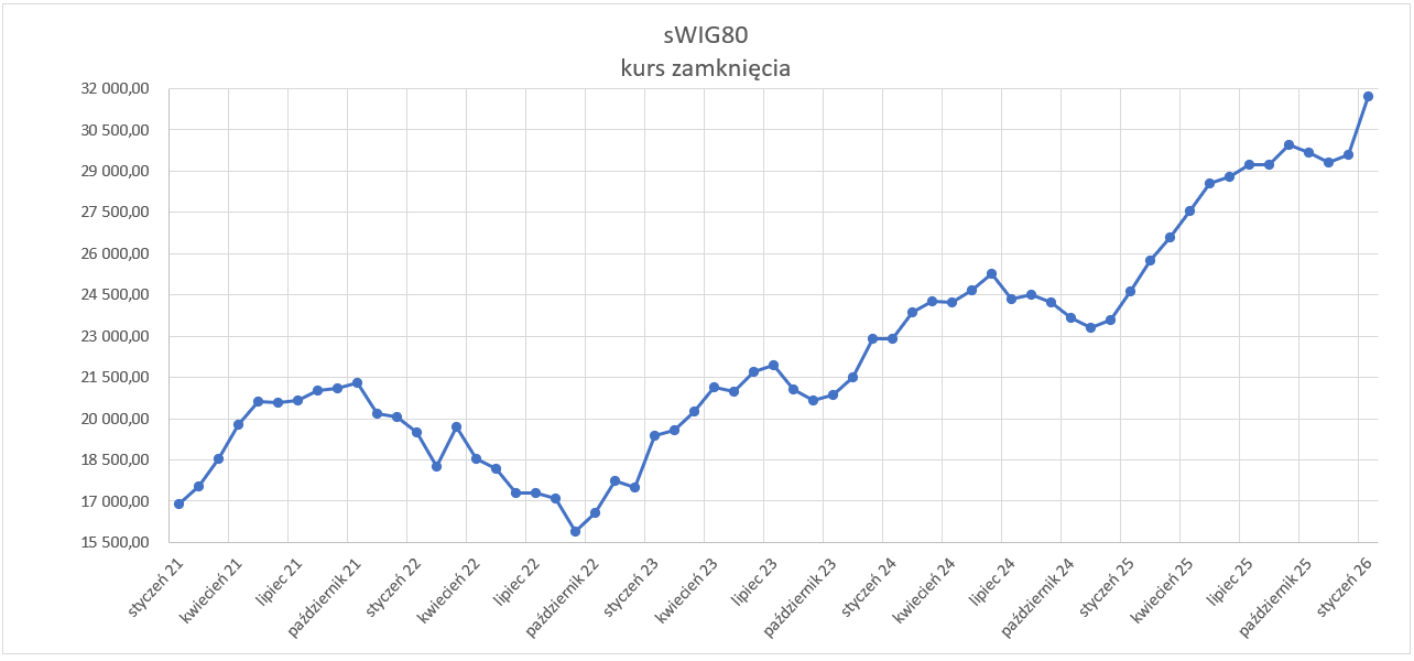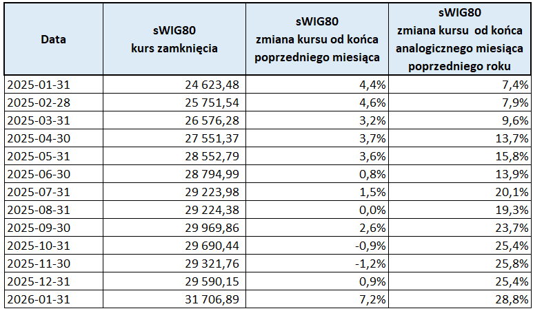 Ten indeks ukształtował się tym razem analogicznie, to znaczy odnotował wyraźny wzrost. Indeks sWIG80 na koniec stycznia wynosił 31 706,89 pkt, co oznacza wzrost o 7,2% względem grudnia. Tak dużych przyrostów miesięcznych nie obserwowano od 2023 roku. W ujęciu rocznym odnotowano wzrost o 28,8%. Szczegóły w poniższej tabeli.